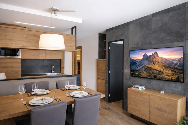 Grazioso trilocale al Residence Veronza con balcone, ideale per famiglie o piccoli gruppi che cercano una vacanza comoda in montagna con i servizi del residence inclusi.
