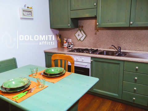 Accogliente mansarda in stile montano, ristrutturata, con living (divano, poltrona, TV), cucina con zona pranzo (tavolo, panca, sedie) e accesso al balcone. Zona notte con camera matrimoniale e camera soppalcata (matrimoniale). Bagno con box doccia e lavatrice; corridoio con armadio e panca. 4 posti letto totali.